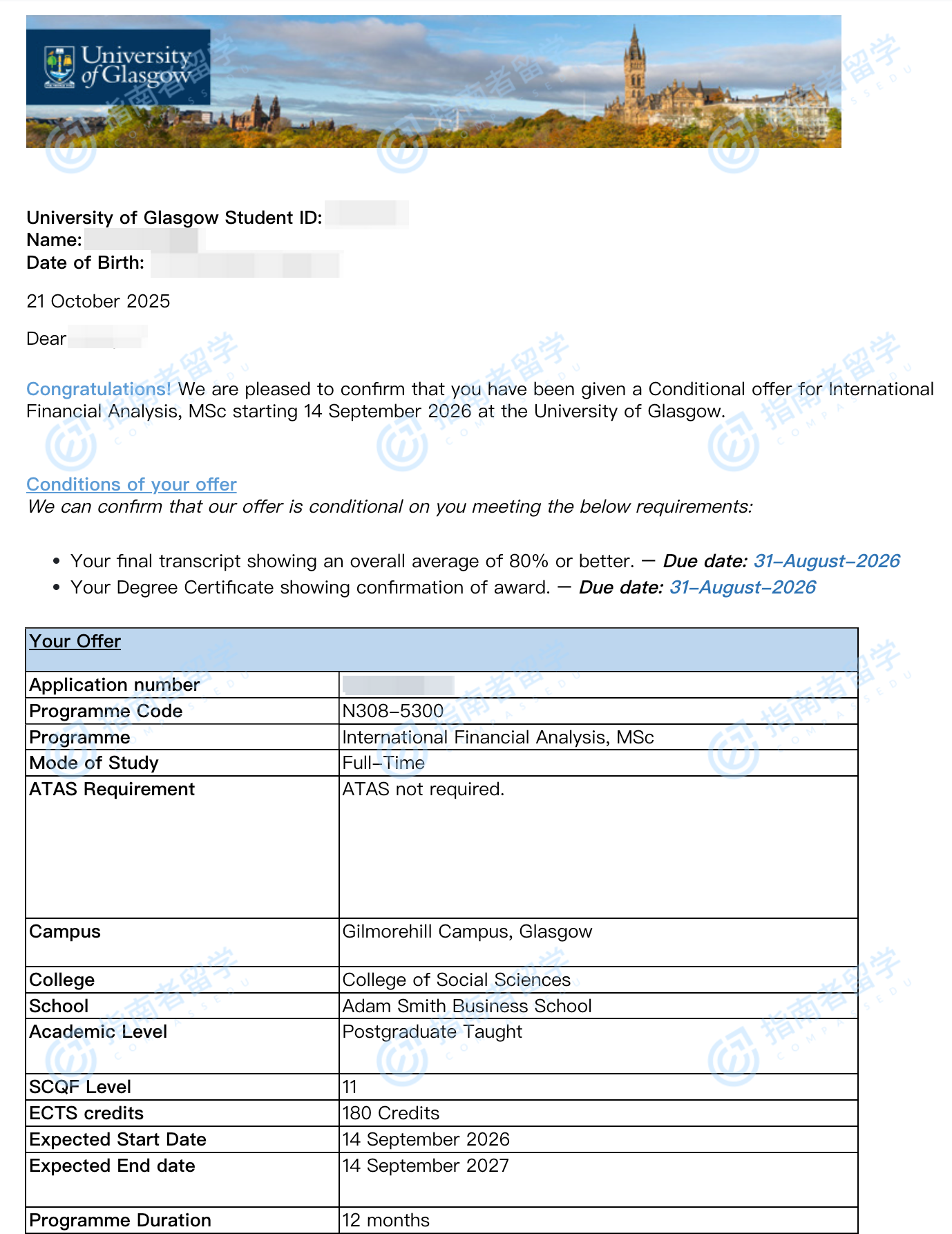 格拉斯哥大學(xué)國際金融分析理學(xué)碩士研究生offer一枚