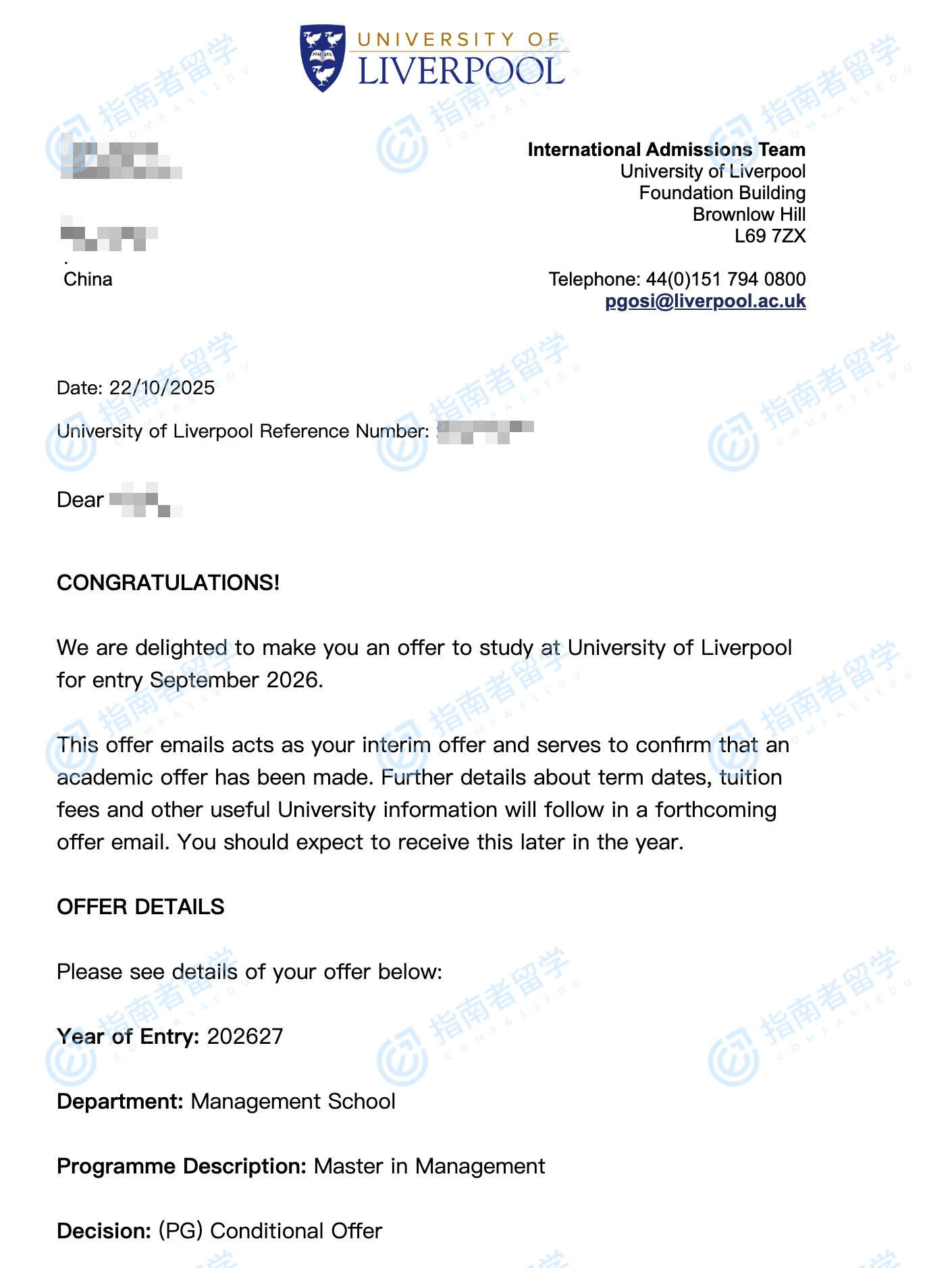 利物浦大學(xué)管理學(xué)碩士研究生offer一枚