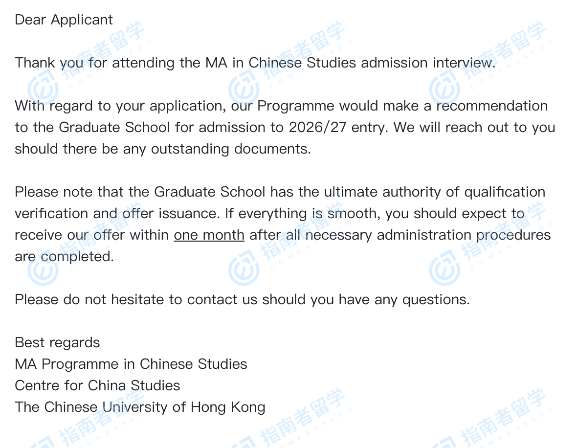 香港中文大學(xué)中國(guó)研究文學(xué)碩士研究生offer一枚