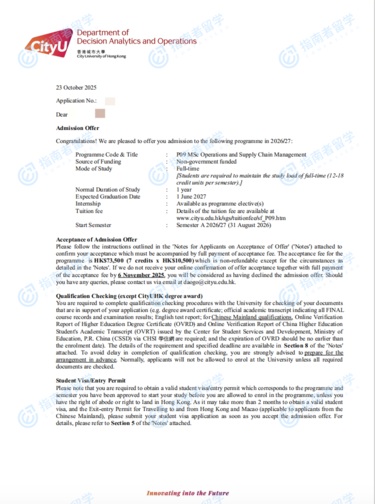 香港城市大學(xué)營運與供應(yīng)鏈管理理學(xué)碩士研究生offer一枚