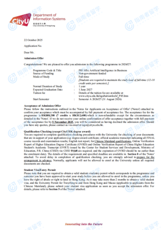 香港城市大學(xué)商業(yè)人工智能理學(xué)碩士研究生offer一枚