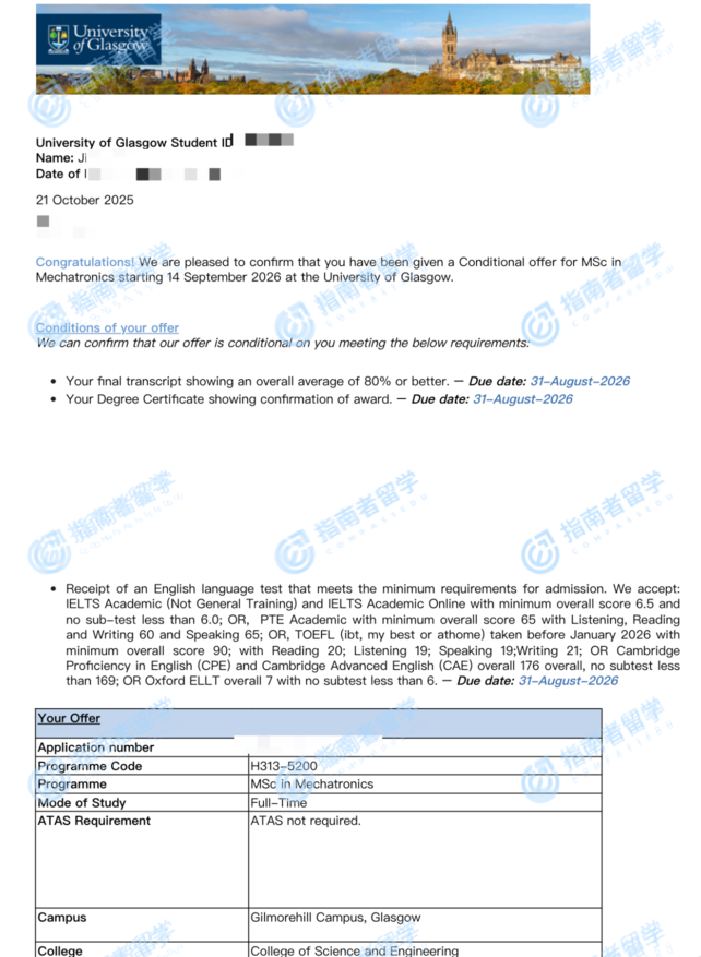 格拉斯哥大學(xué)機(jī)械電子學(xué)理學(xué)碩士研究生offer一枚