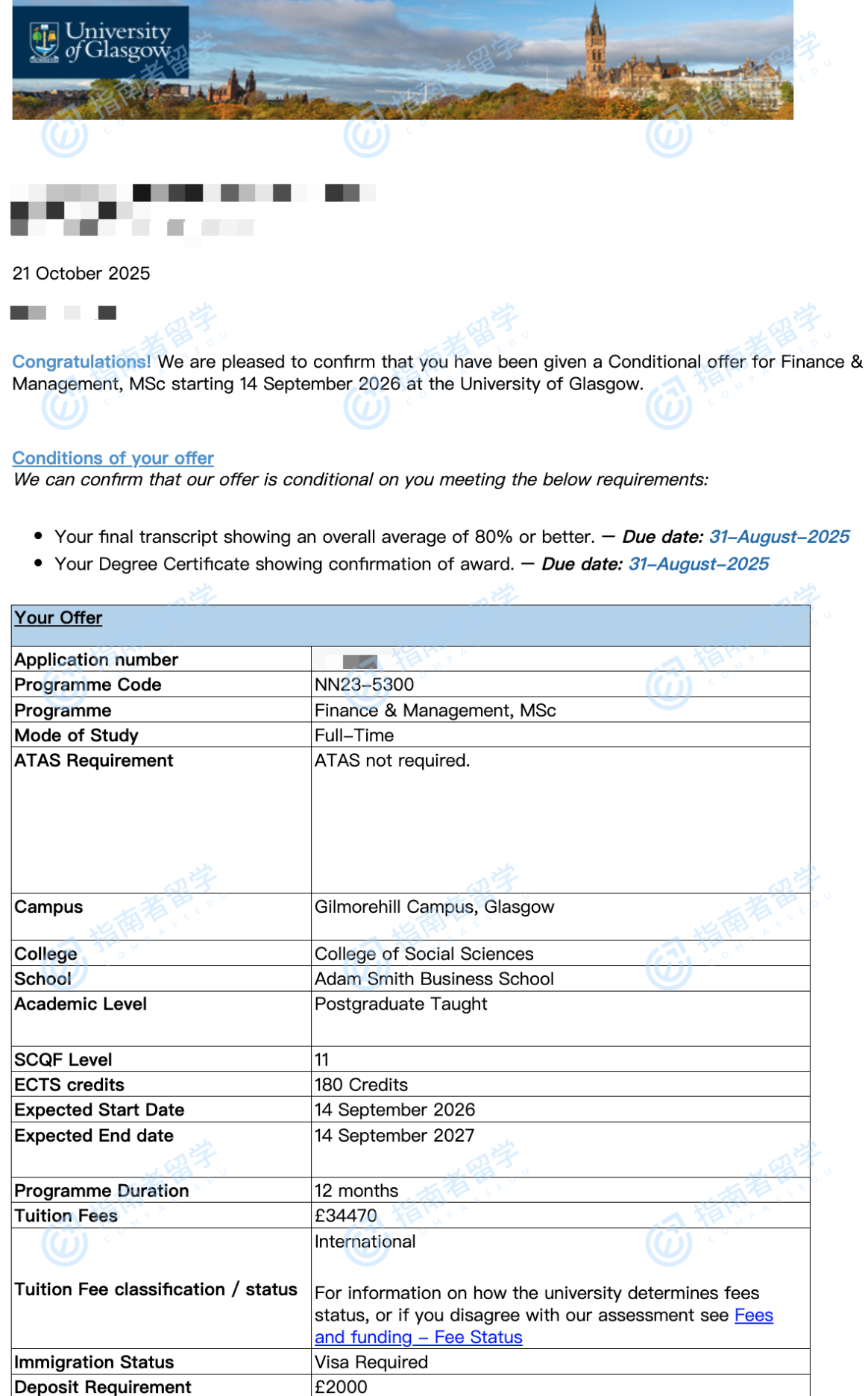 格拉斯哥大學金融與管理理學碩士研究生offer一枚