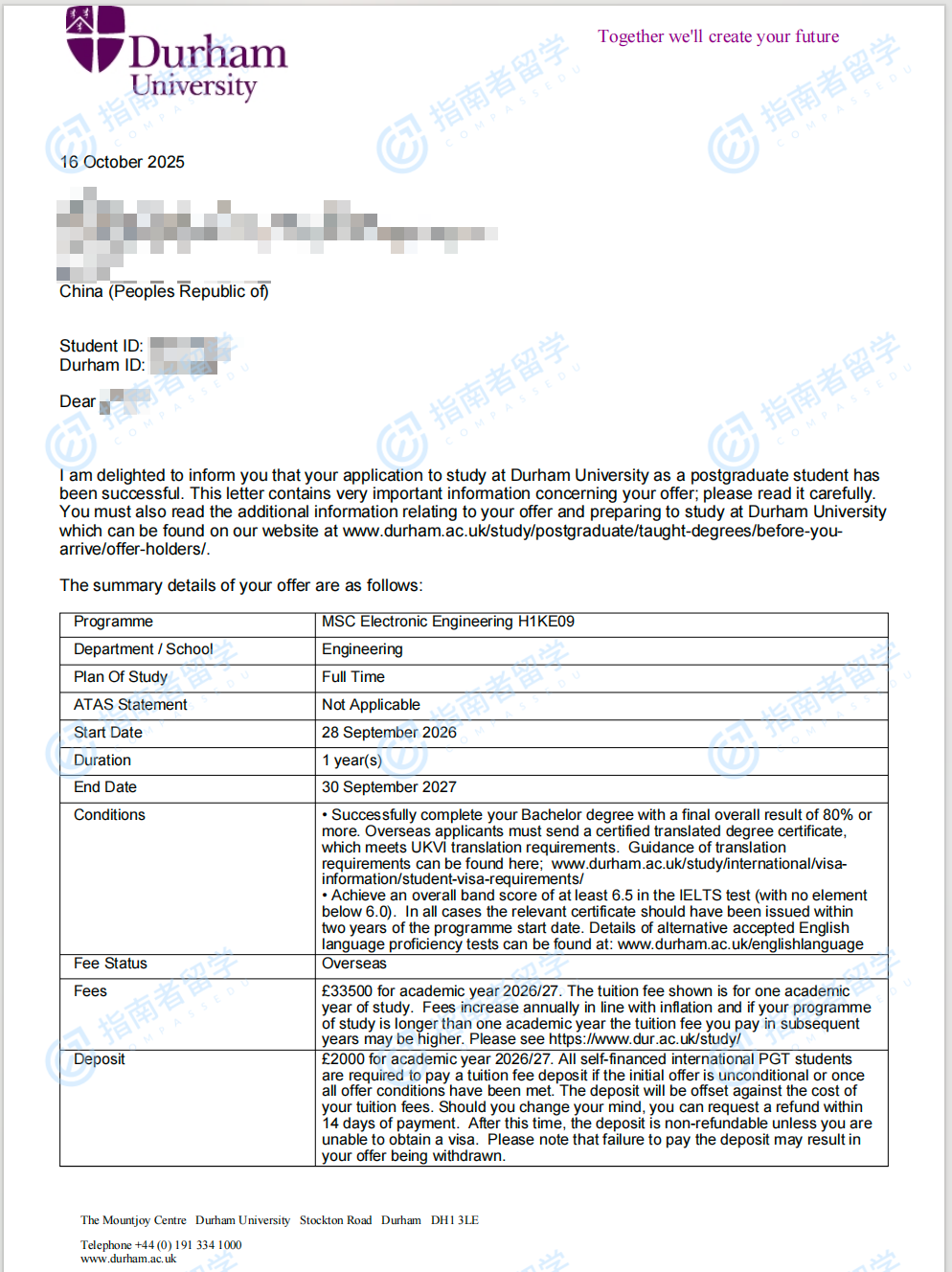 杜倫大學(xué)電子工程理學(xué)碩士研究生offer一枚