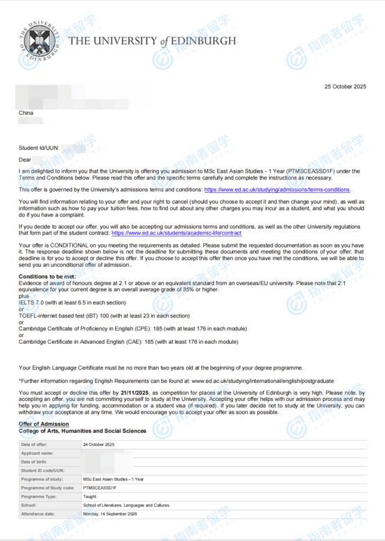 愛丁堡大學(xué)東亞研究理學(xué)碩士研究生offer一枚