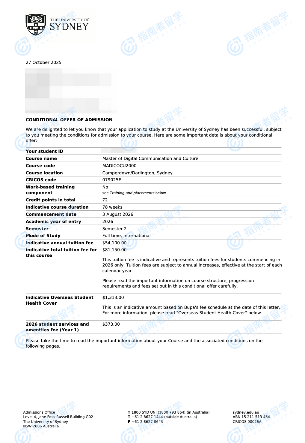 悉尼大學(xué)數(shù)字傳播與文化碩士研究生offer一枚
