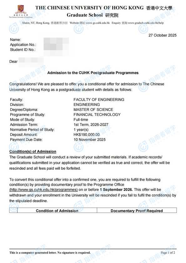 香港中文大學(xué)金融科技理學(xué)碩士研究生offer一枚