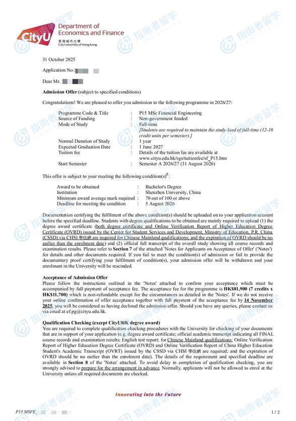 香港城市大學(xué)金融工程學(xué)理學(xué)碩士研究生offer一枚