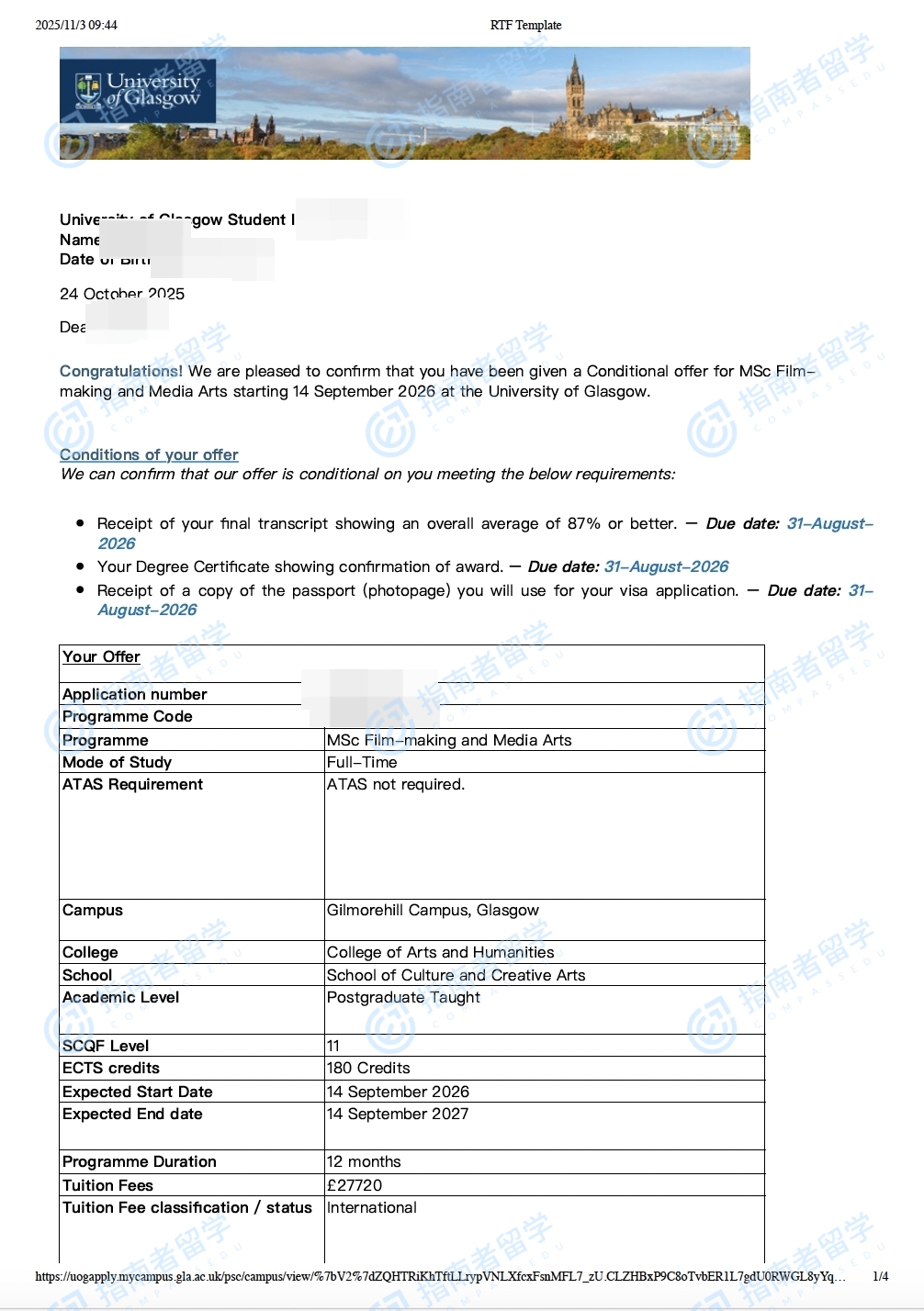 格拉斯哥大學(xué)電影制作與媒體藝術(shù)理學(xué)碩士研究生offer一枚