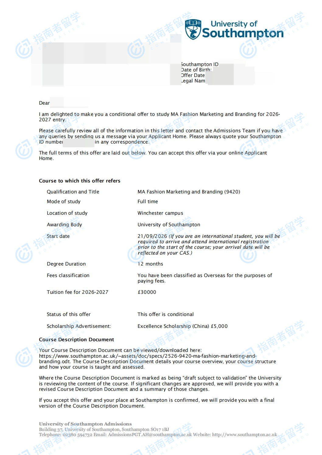 南安普頓大學(xué)時尚營銷與品牌文學(xué)碩士研究生offer一枚