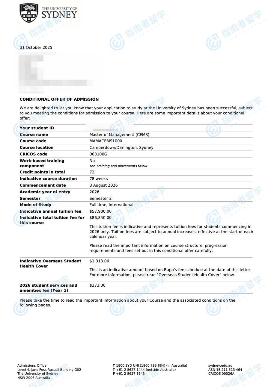 悉尼大學(xué)管理學(xué)碩士(CEMS)研究生offer一枚