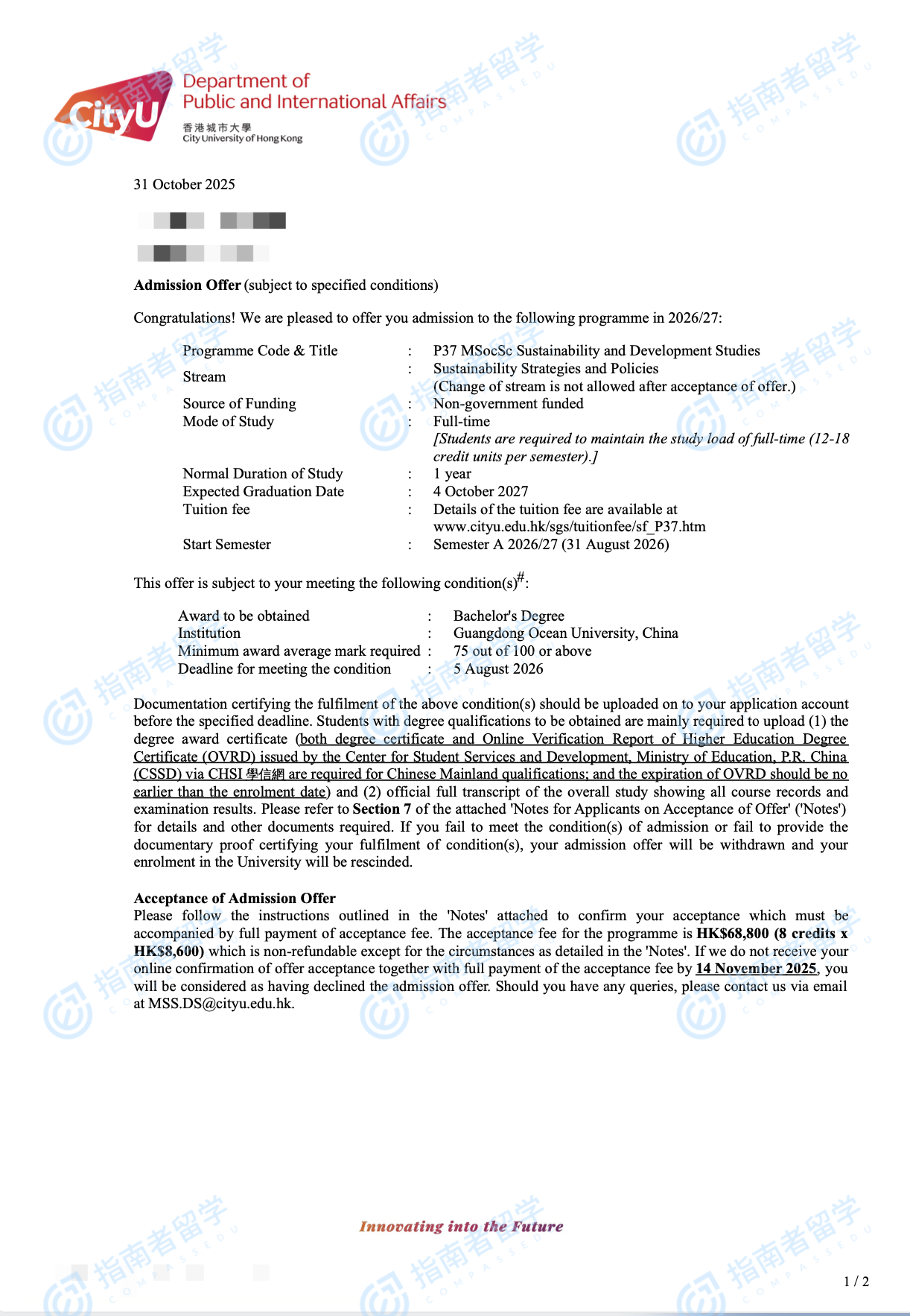 香港城市大學可持續(xù)與發(fā)展研究社會科學碩士研究生offer一枚
