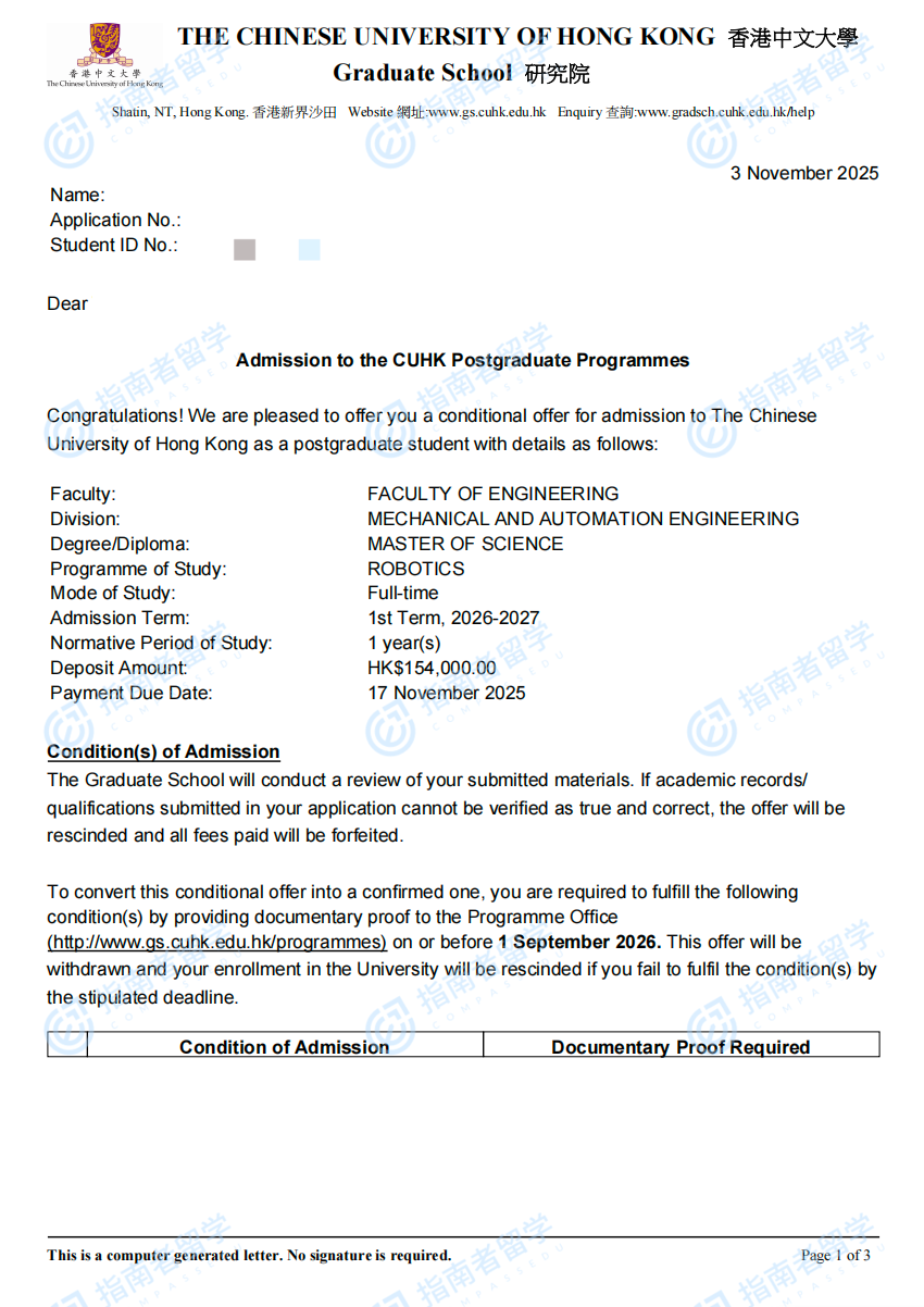 香港中文大學(xué)機(jī)器人學(xué)理學(xué)碩士研究生offer一枚