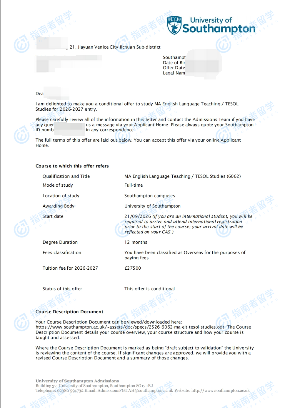 南安普頓大學(xué)英語語言教學(xué)/對外英語教學(xué)研究文學(xué)碩士研究生offer一枚