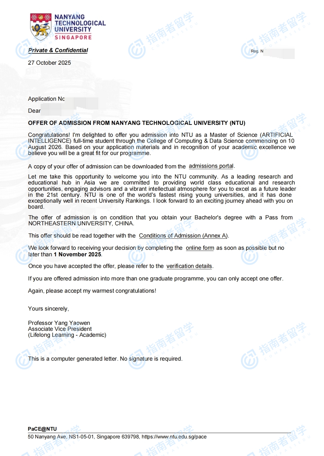 南洋理工大學(xué)人工智能理學(xué)碩士研究生offer一枚