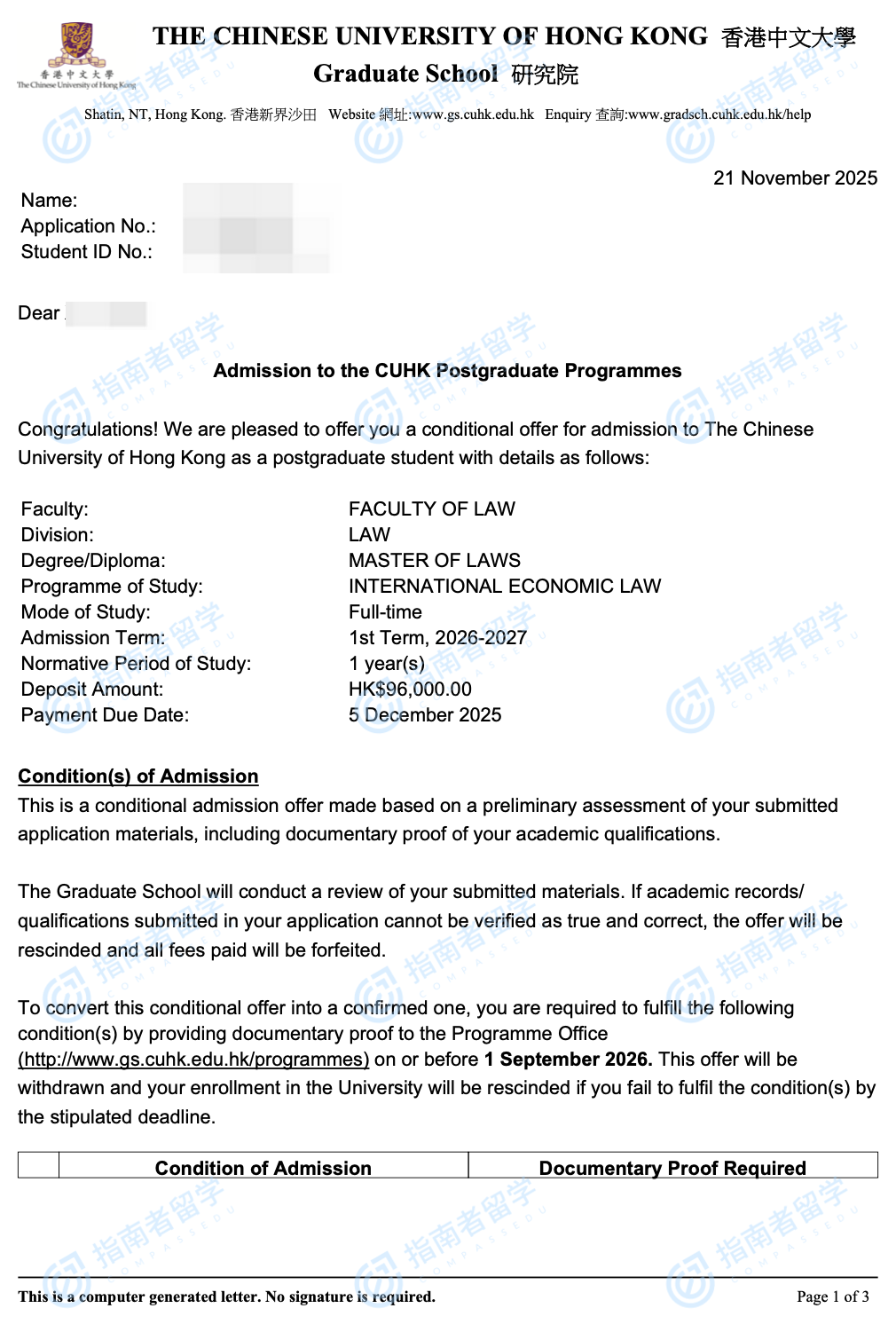 香港中文大學(xué)國際經(jīng)濟法法學(xué)碩士研究生offer一枚