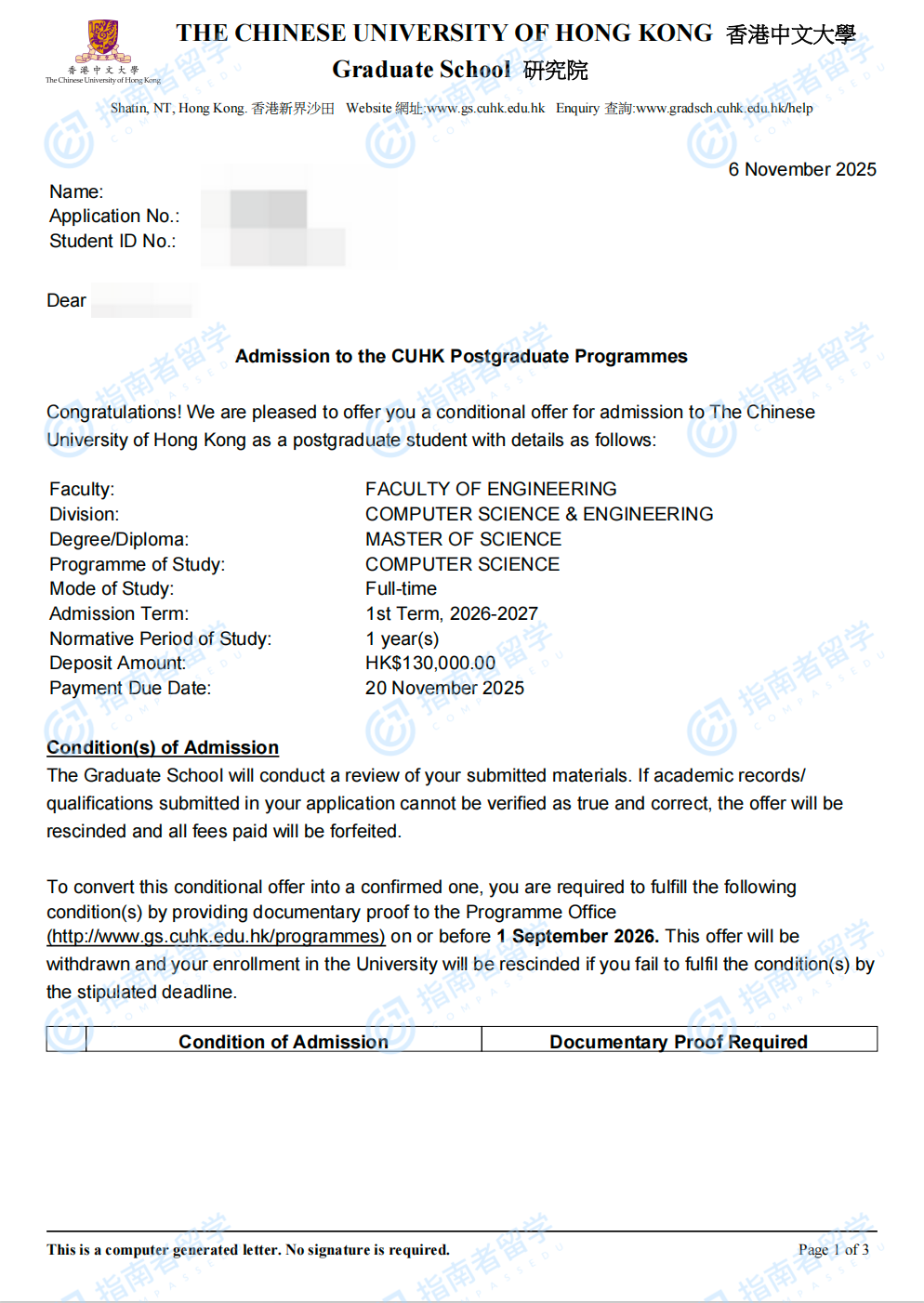 香港中文大學(xué)計算機科學(xué)理學(xué)碩士研究生offer一枚