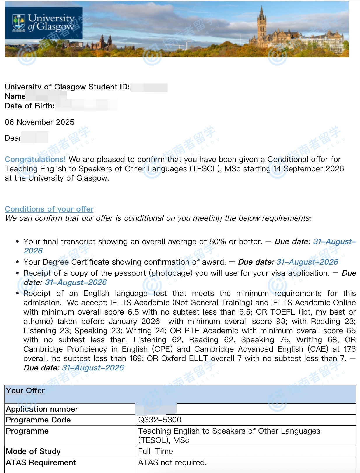 格拉斯哥大學(xué)對外英語教學(xué)理學(xué)碩士研究生offer一枚