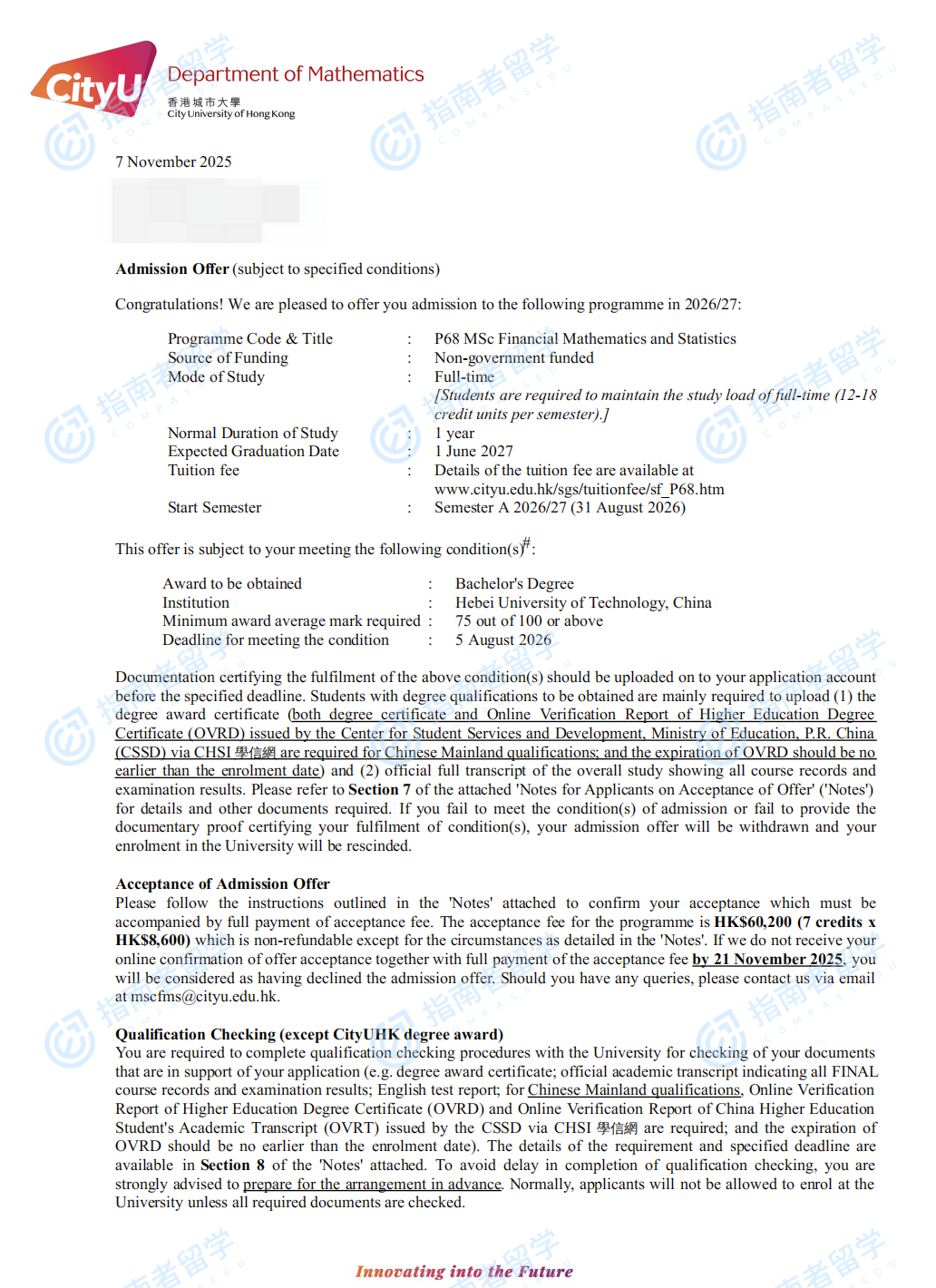 香港城市大學(xué)金融數(shù)學(xué)與統(tǒng)計(jì)理學(xué)碩士研究生offer一枚