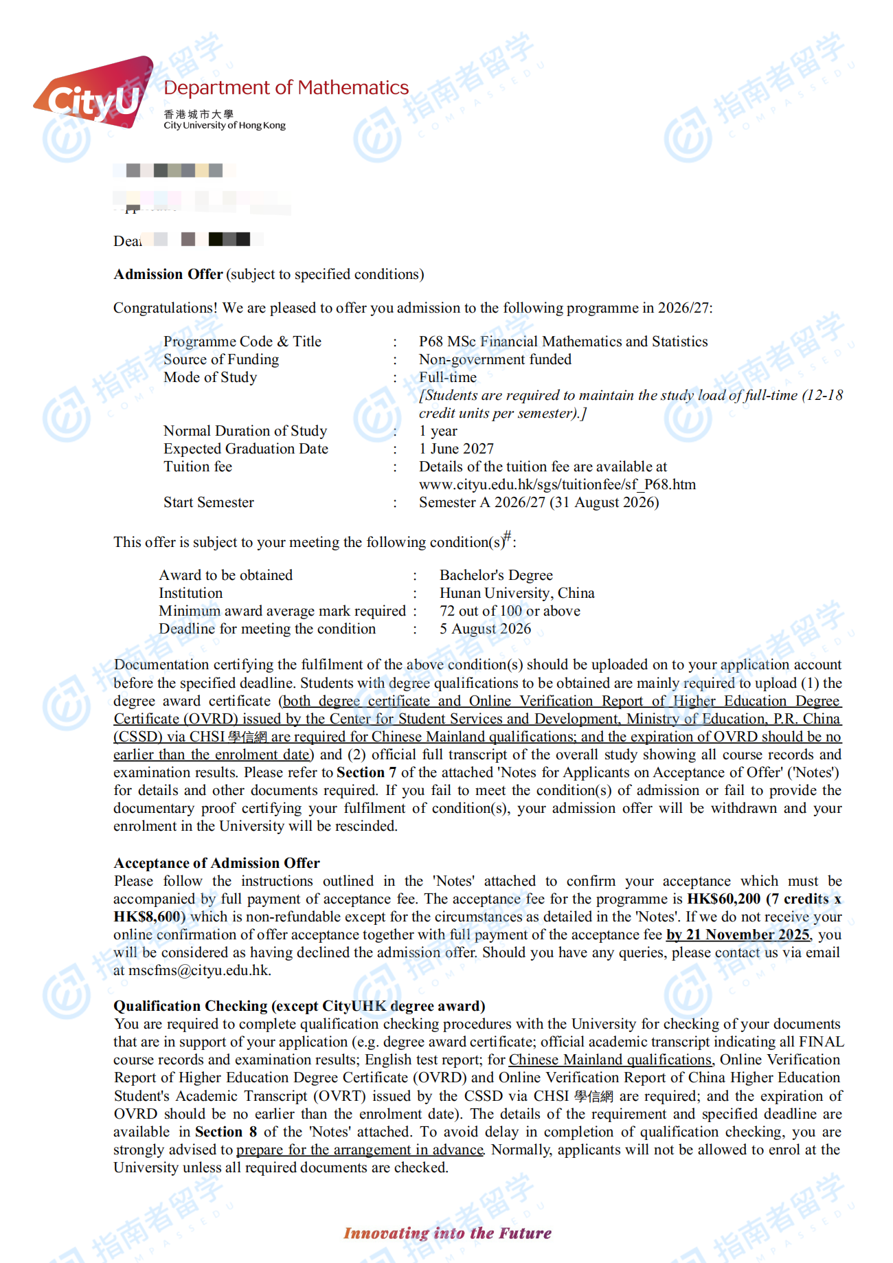 香港城市大學(xué)金融數(shù)學(xué)與統(tǒng)計(jì)理學(xué)碩士研究生offer一枚