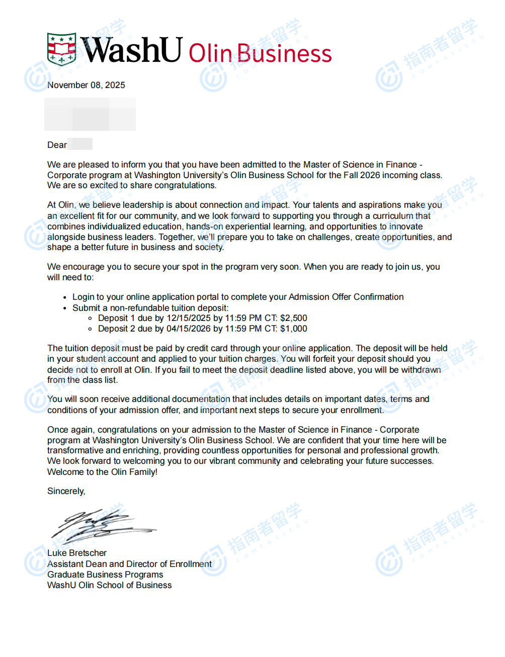 圣路易斯華盛頓大學(xué)金融碩士研究生offer一枚