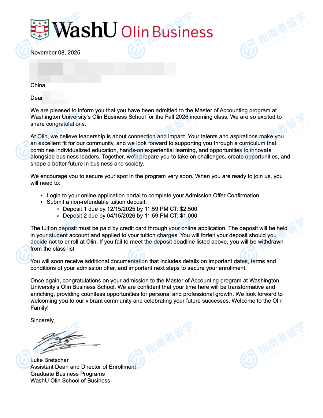 圣路易斯華盛頓大學(xué)會(huì)計(jì)碩士研究生offer一枚