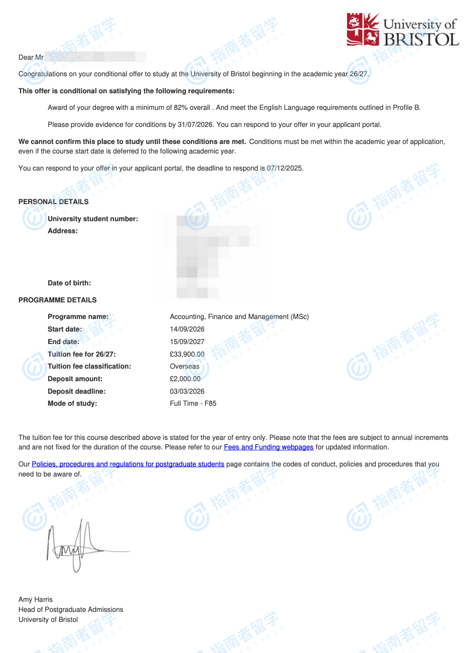 布里斯托大學(xué)會計、金融與管理理學(xué)碩士研究生offer一枚