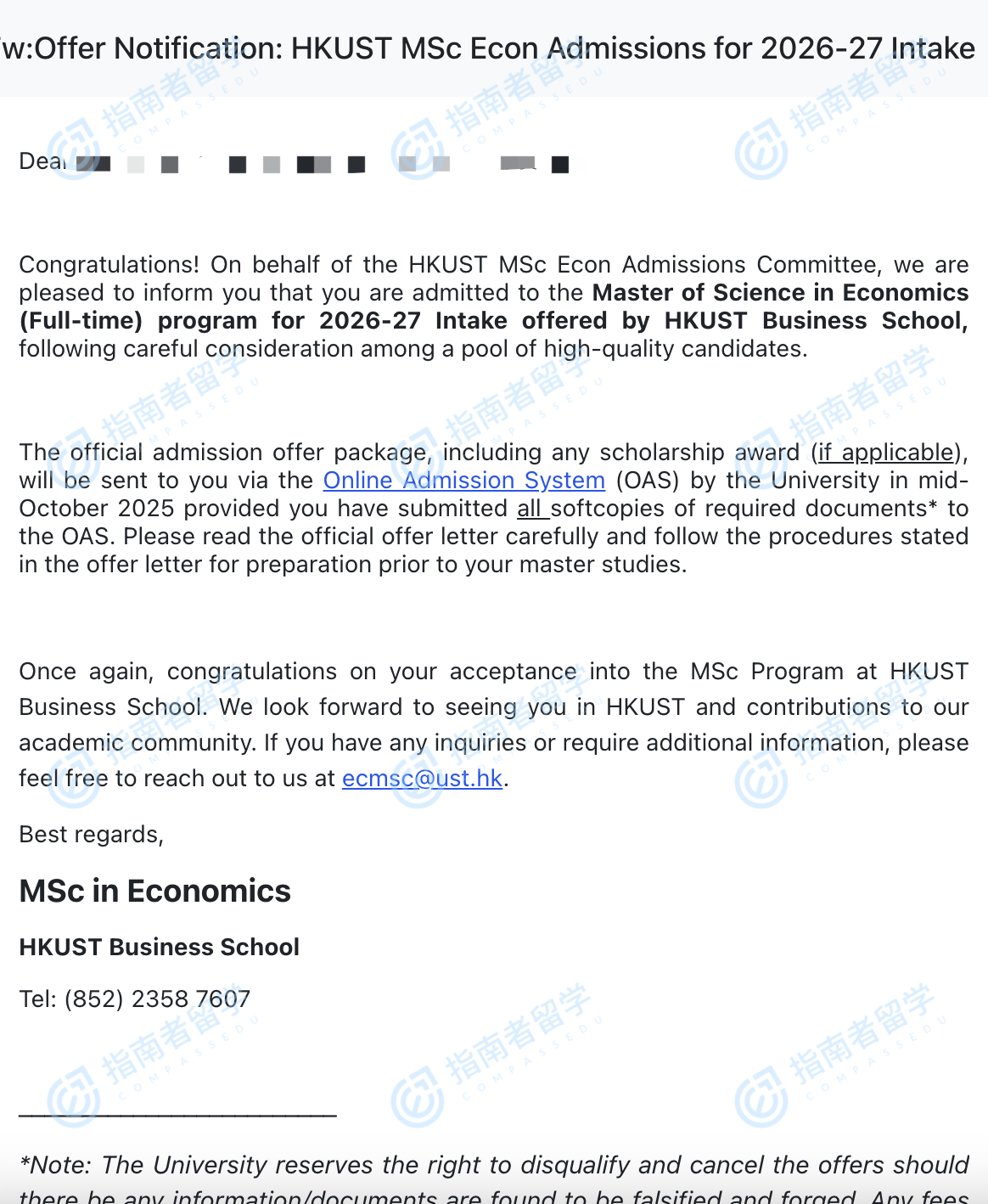 香港科技大學(xué)經(jīng)濟(jì)學(xué)理學(xué)碩士研究生offer一枚