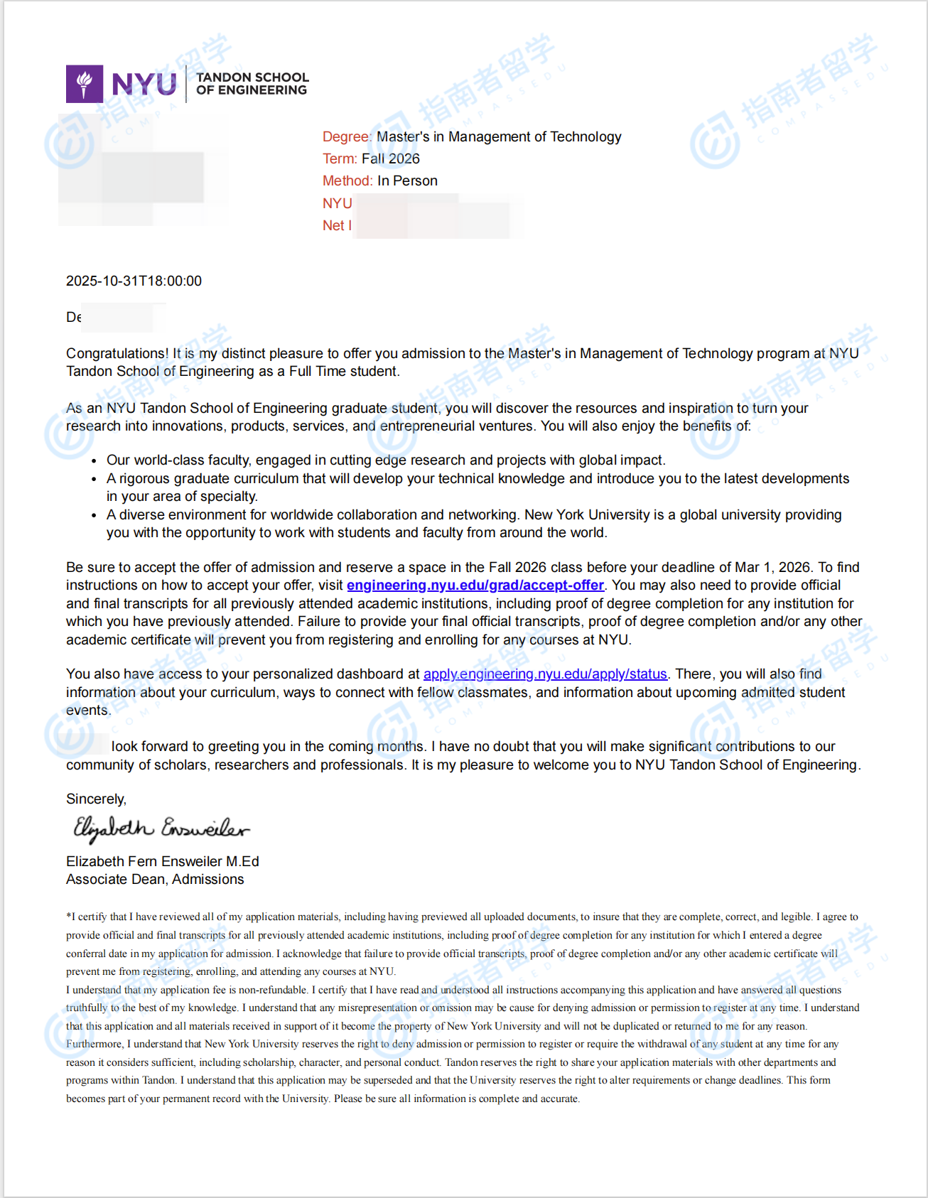 紐約大學(xué)科技管理理學(xué)碩士研究生offer一枚