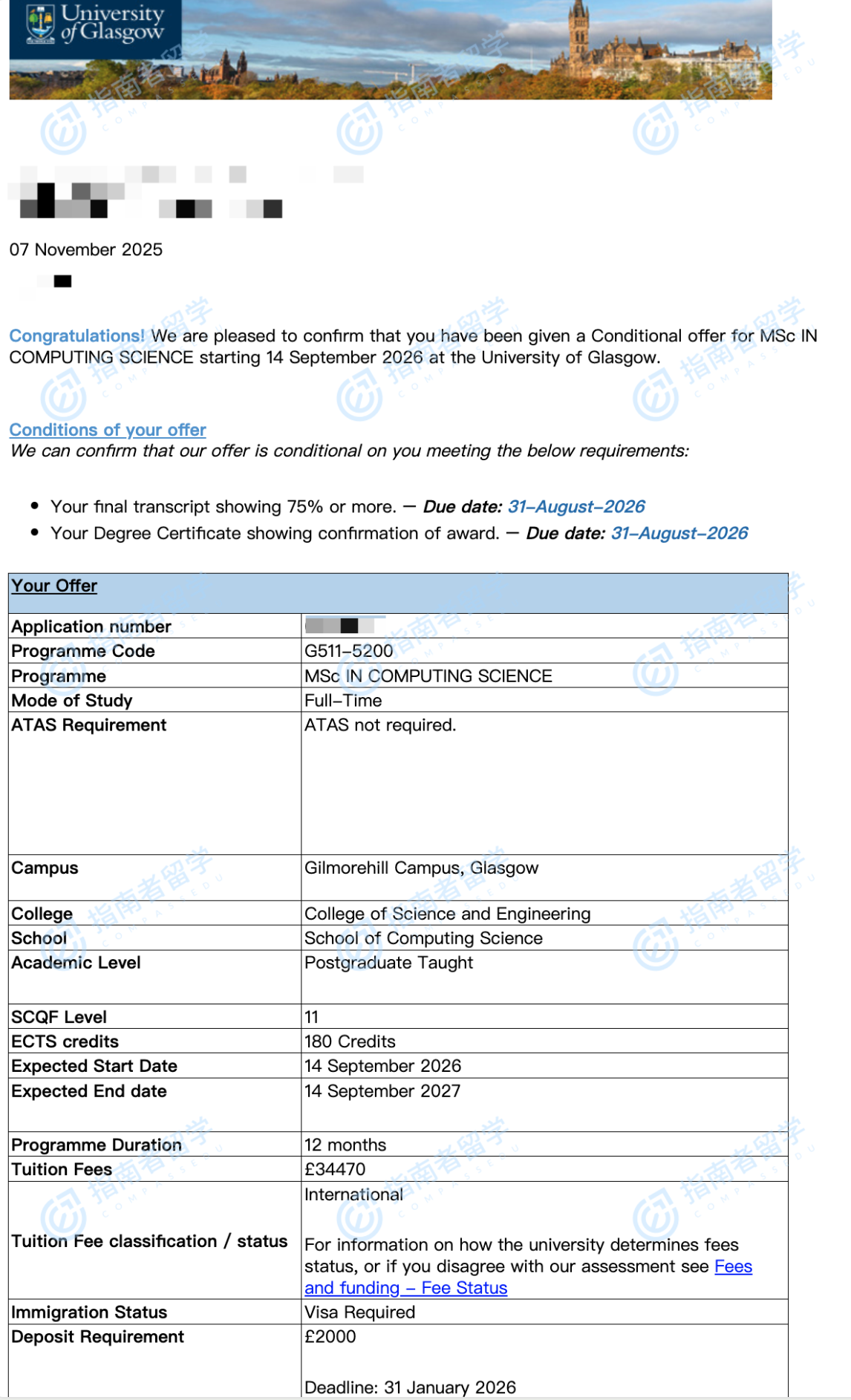格拉斯哥大學(xué)計算科學(xué)理學(xué)碩士研究生offer一枚