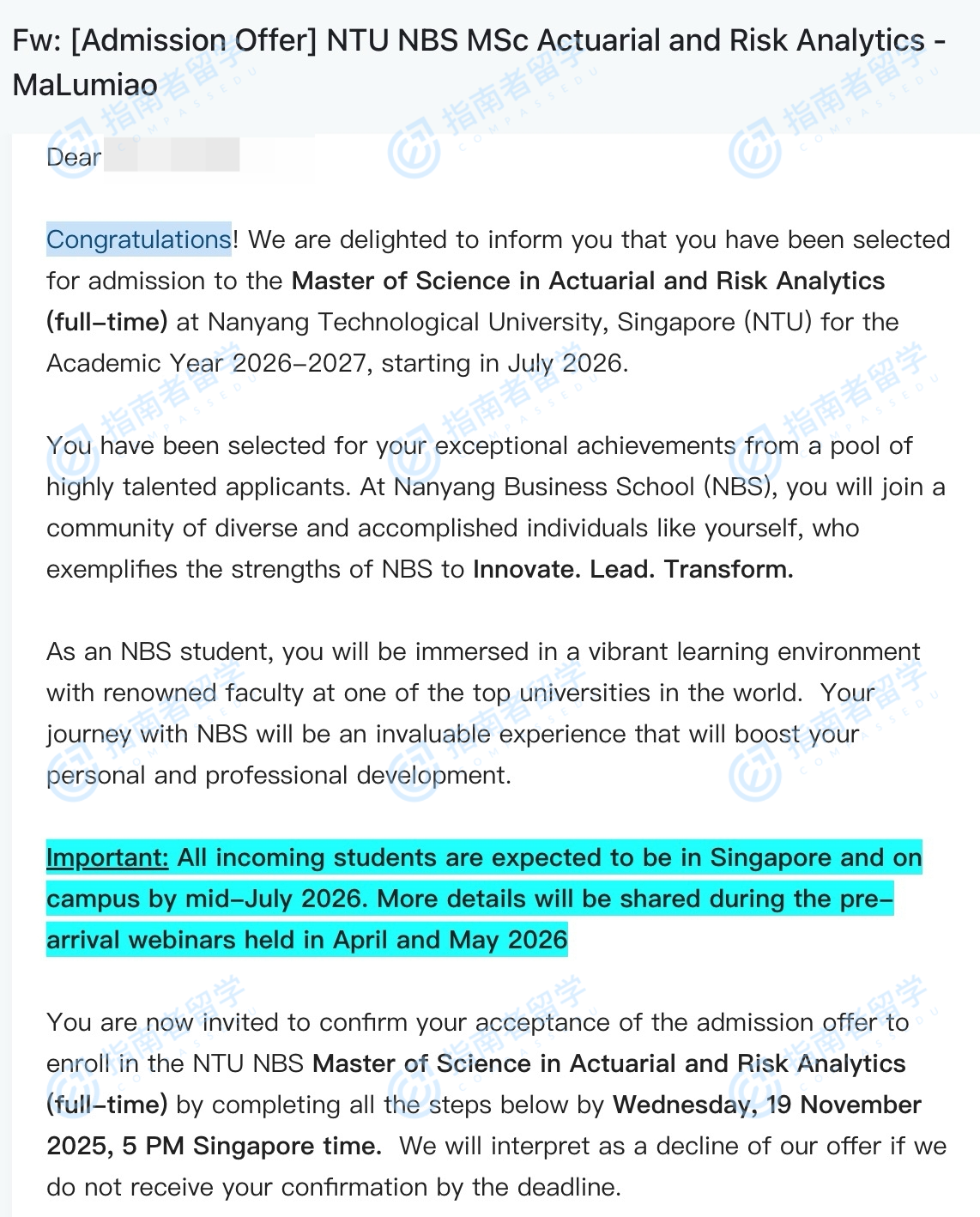 南洋理工大學(xué)精算與風(fēng)險分析理學(xué)碩士研究生offer一枚