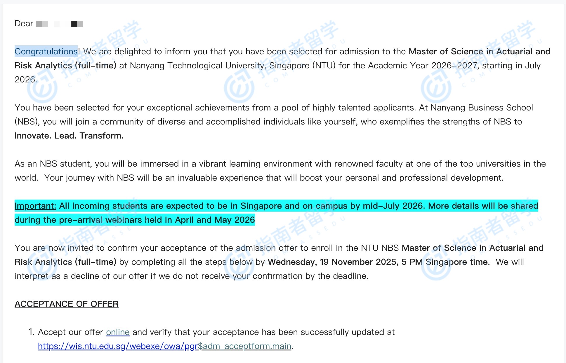 南洋理工大學(xué)精算與風(fēng)險(xiǎn)分析理學(xué)碩士研究生offer一枚