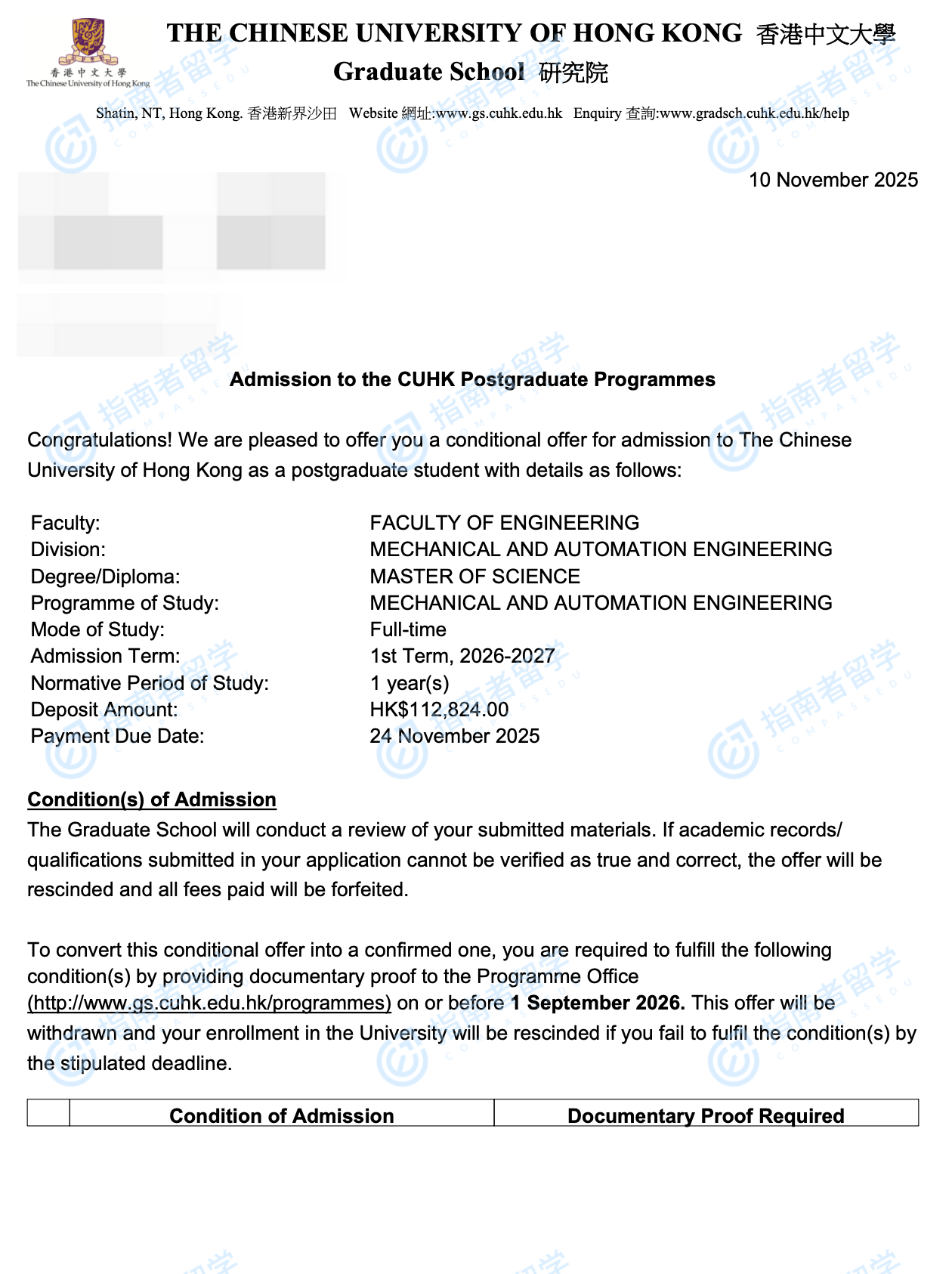香港中文大學機械與自動化工程理學碩士研究生offer一枚