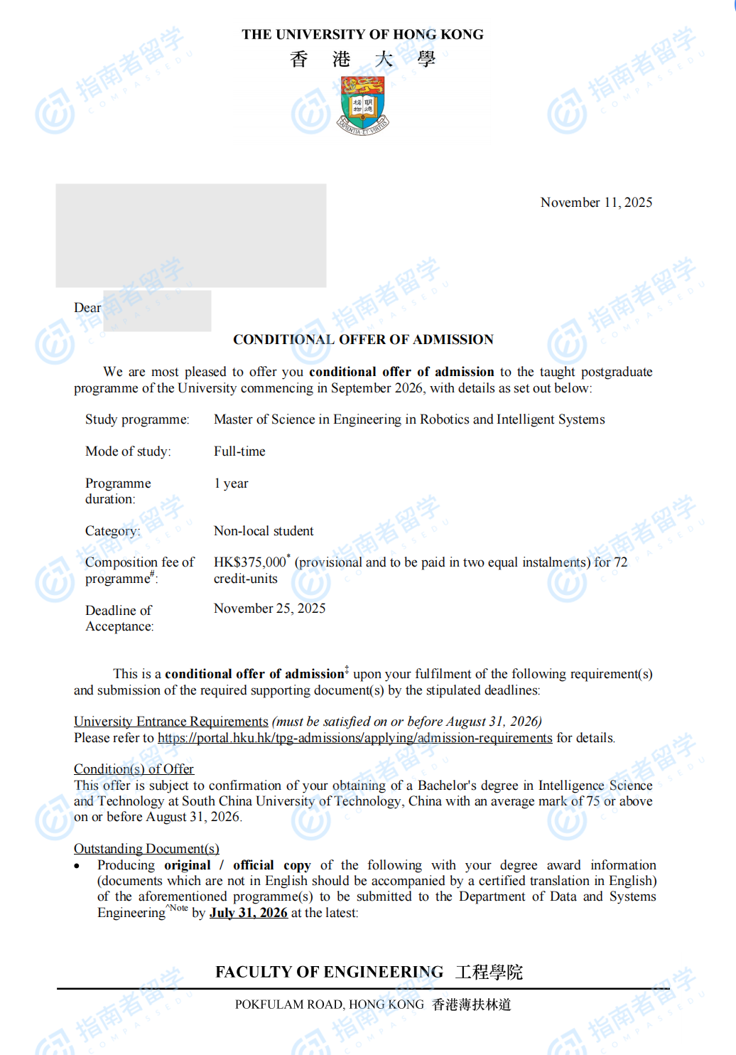 香港大學(xué)機器人與智能系統(tǒng)(工程)理學(xué)碩士研究生offer一枚