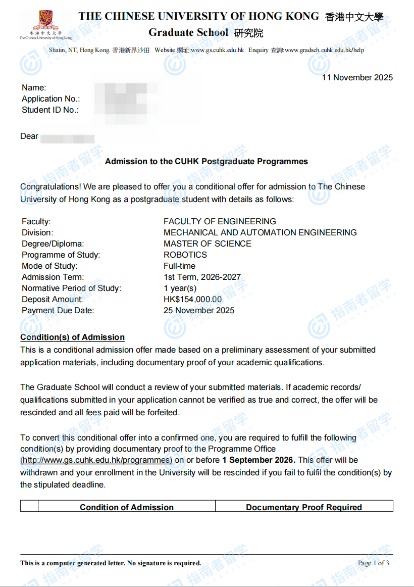 香港中文大學(xué)機械與自動化工程理學(xué)碩士研究生offer一枚