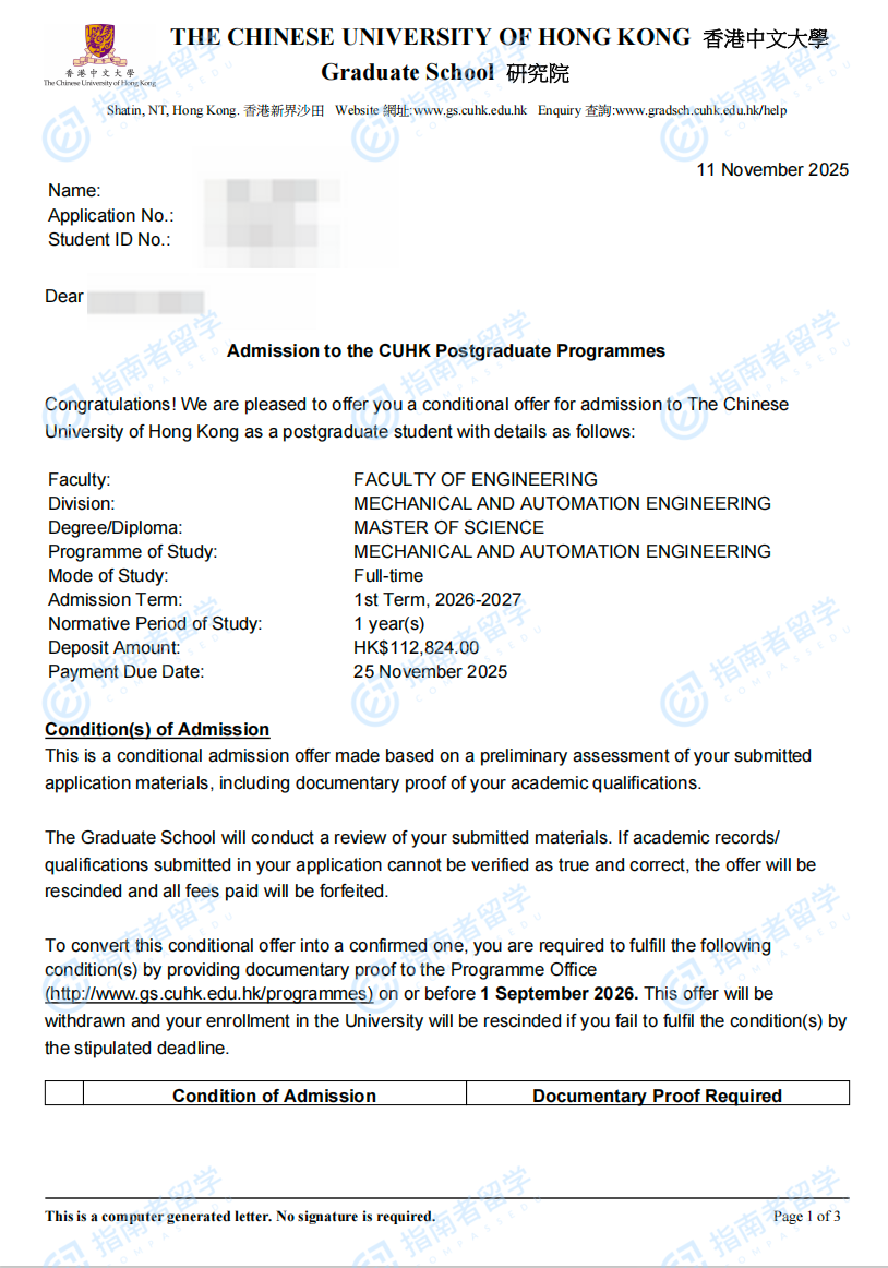 香港中文大學機械與自動化工程理學碩士研究生offer一枚