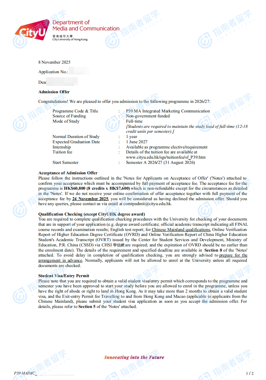 香港城市大學(xué)整合營(yíng)銷傳播文學(xué)碩士研究生offer一枚