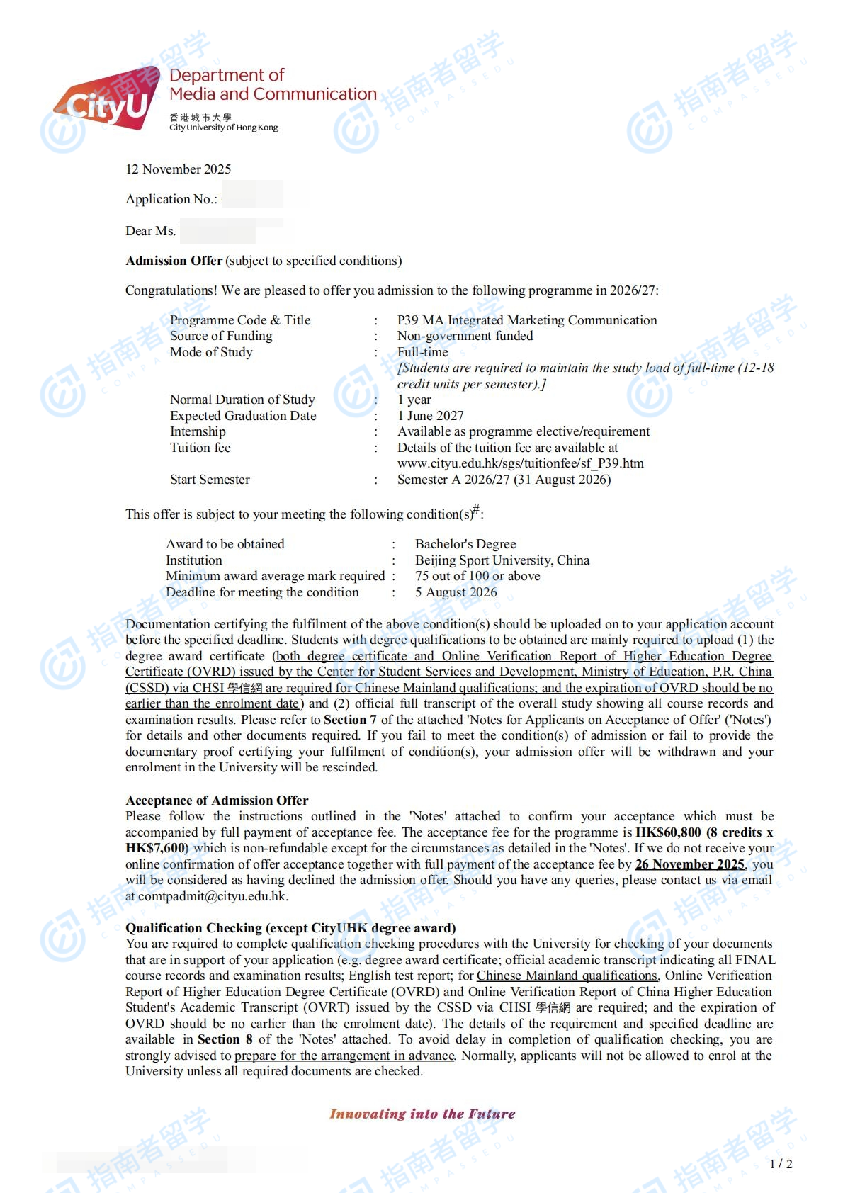 香港城市大學整合營銷傳播文學碩士研究生offer一枚