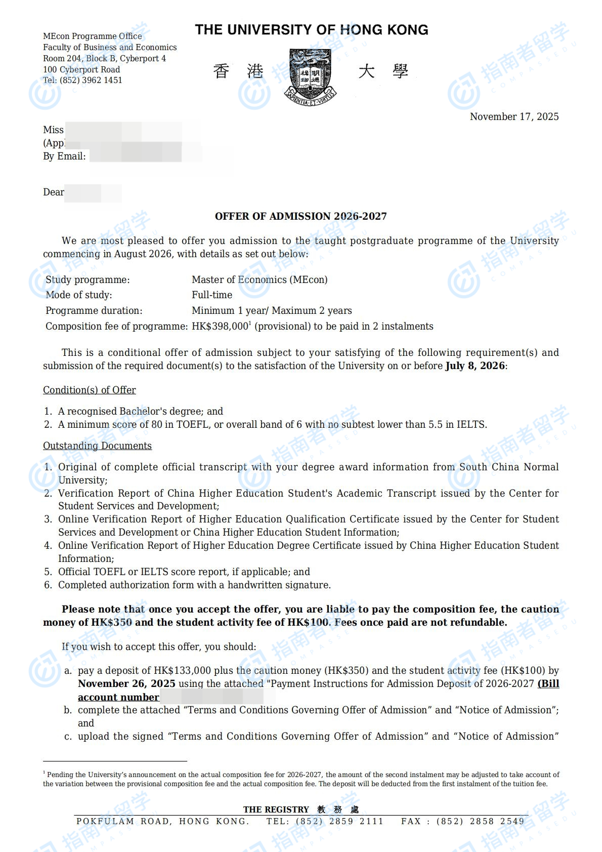 香港大學(xué)經(jīng)濟(jì)學(xué)碩士研究生offer一枚