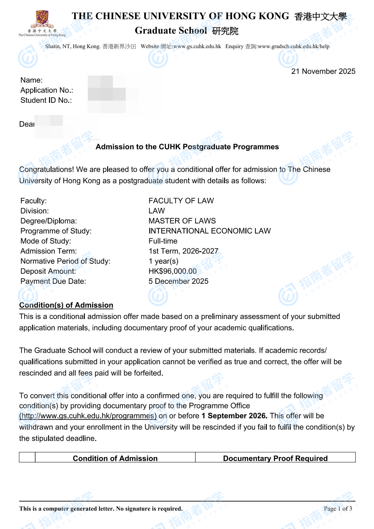 香港中文大學國際經(jīng)濟法法學碩士研究生offer一枚