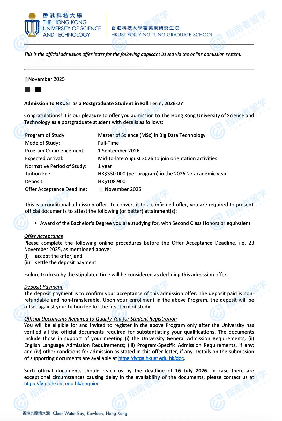 香港科技大學(xué)大數(shù)據(jù)科技理學(xué)碩士研究生offer一枚