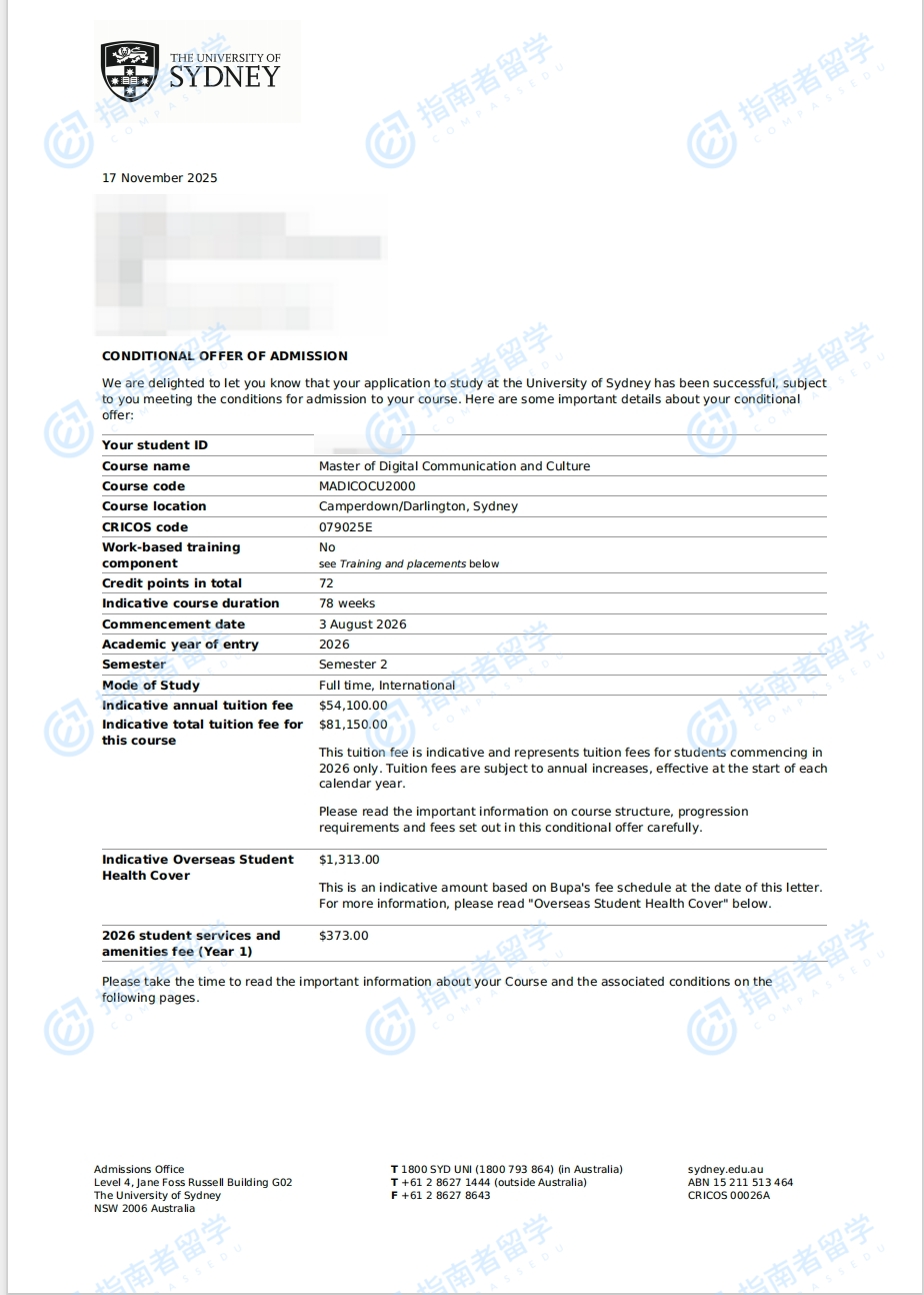 悉尼大學(xué)數(shù)字傳播與文化碩士研究生offer一枚