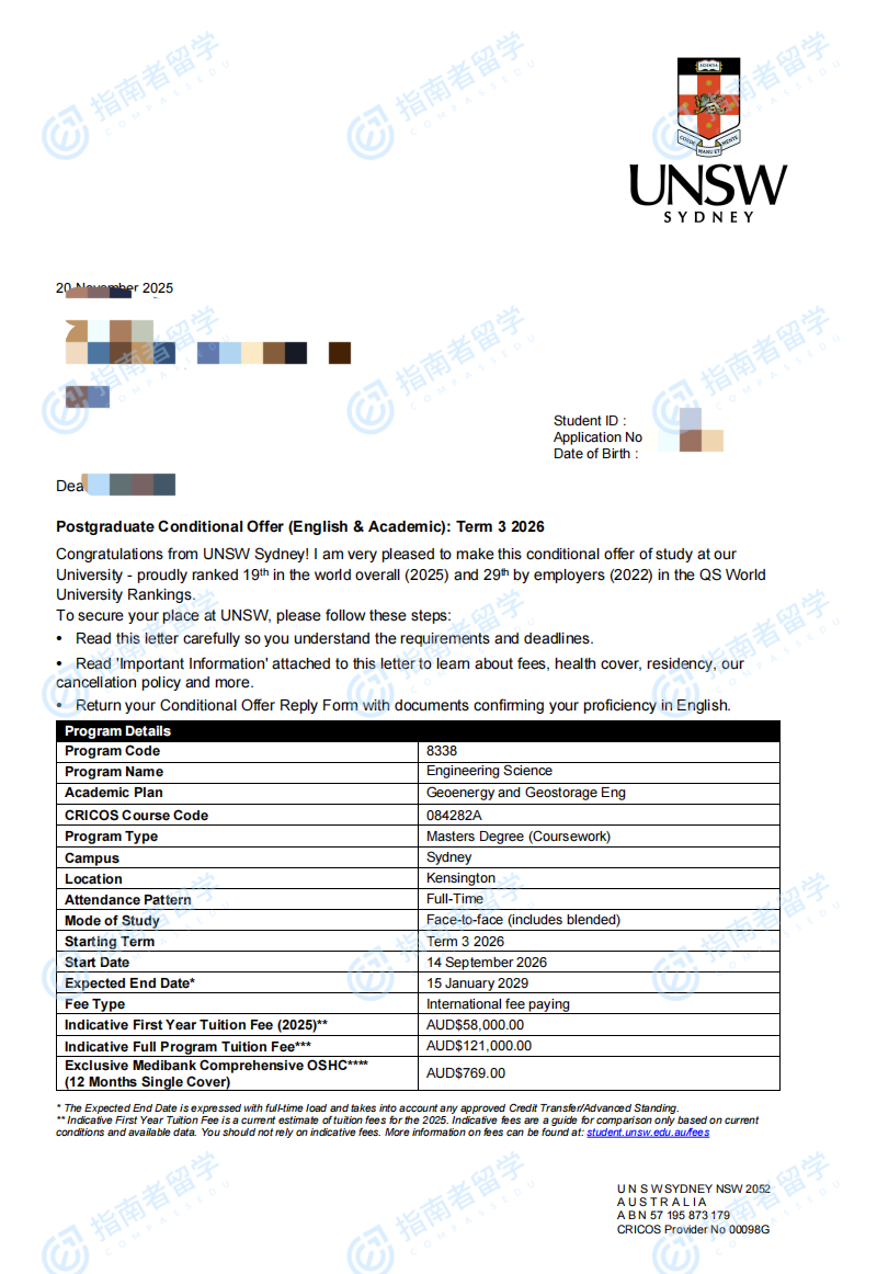 新南威爾士大學(xué)工程科學(xué)碩士(地球能源與地下貯存)研究生offer一枚