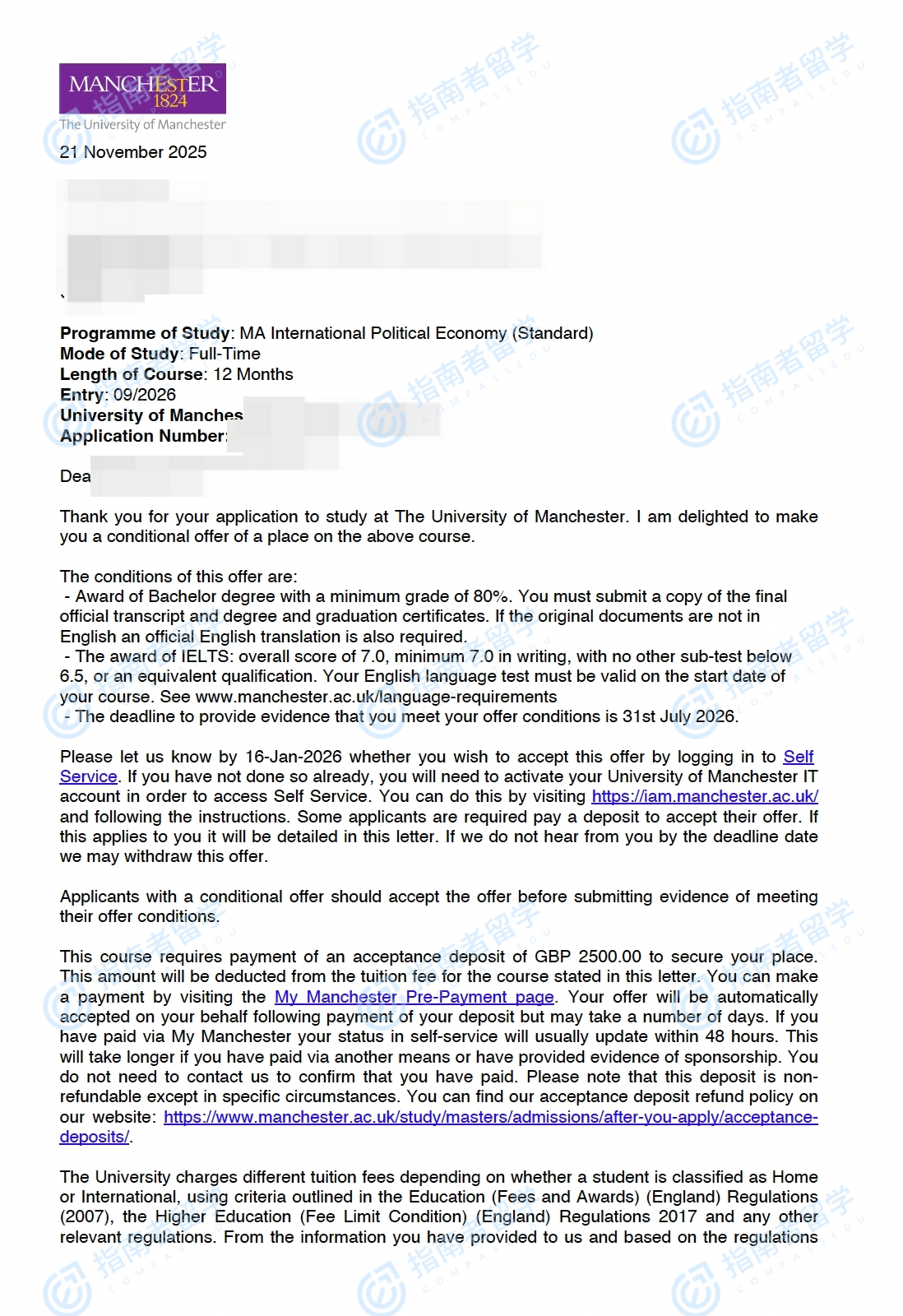 曼徹斯特大學(xué)國(guó)際政治經(jīng)濟(jì)學(xué)文學(xué)碩士(標(biāo)準(zhǔn))研究生offer一枚