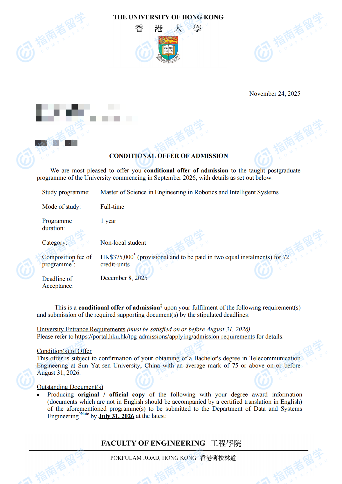 香港大學(xué)機(jī)器人與智能系統(tǒng)(工程)理學(xué)碩士研究生offer一枚
