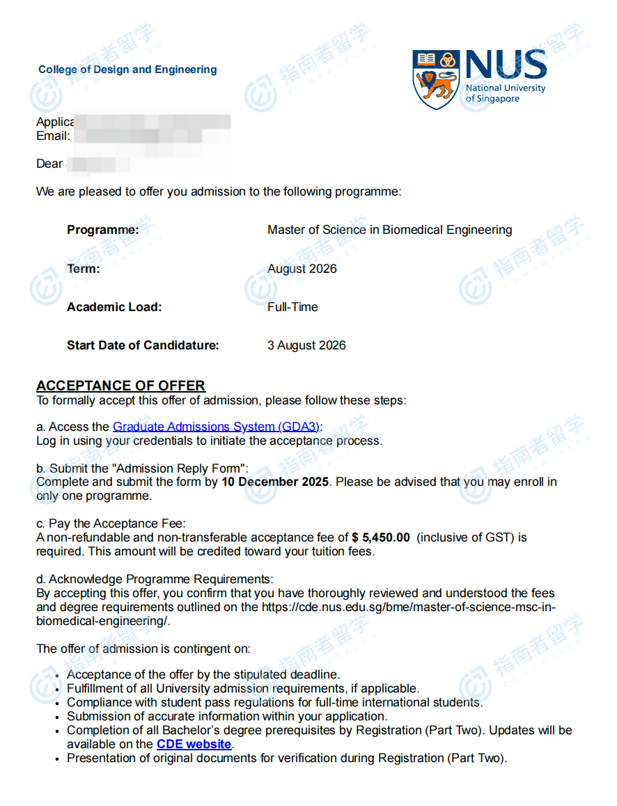 新加坡國(guó)立大學(xué)生物醫(yī)學(xué)工程理學(xué)碩士研究生offer一枚