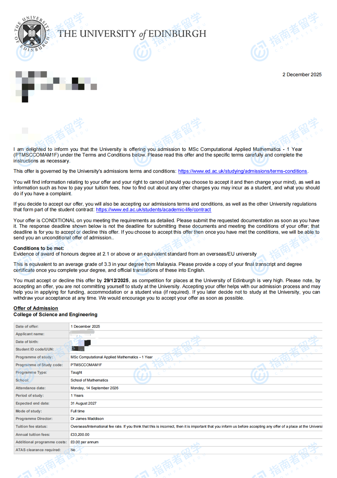 愛丁堡大學(xué)計(jì)算應(yīng)用數(shù)學(xué)理學(xué)碩士研究生offer一枚