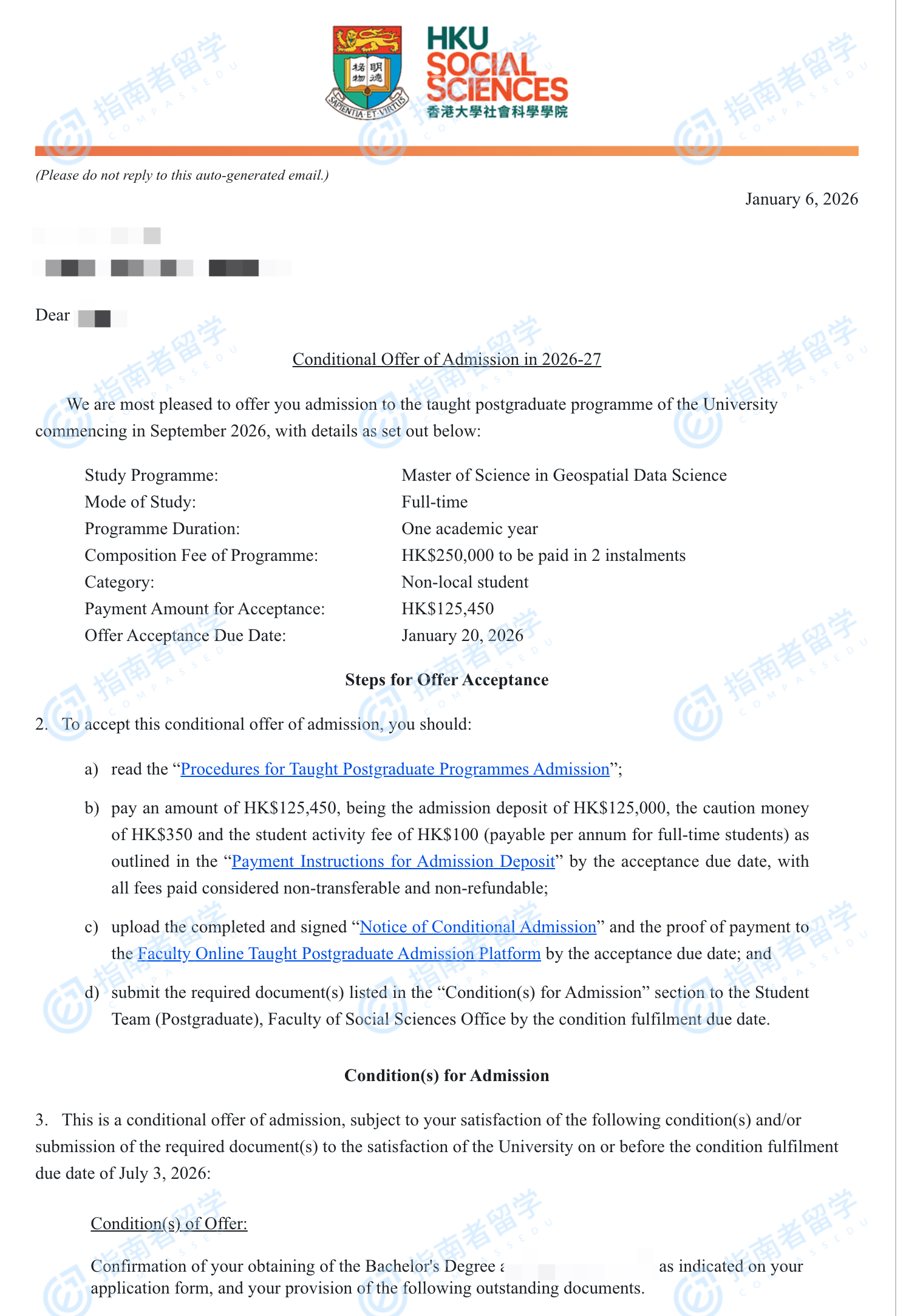 香港大學(xué)地理空間數(shù)據(jù)科學(xué)理學(xué)碩士研究生offer一枚