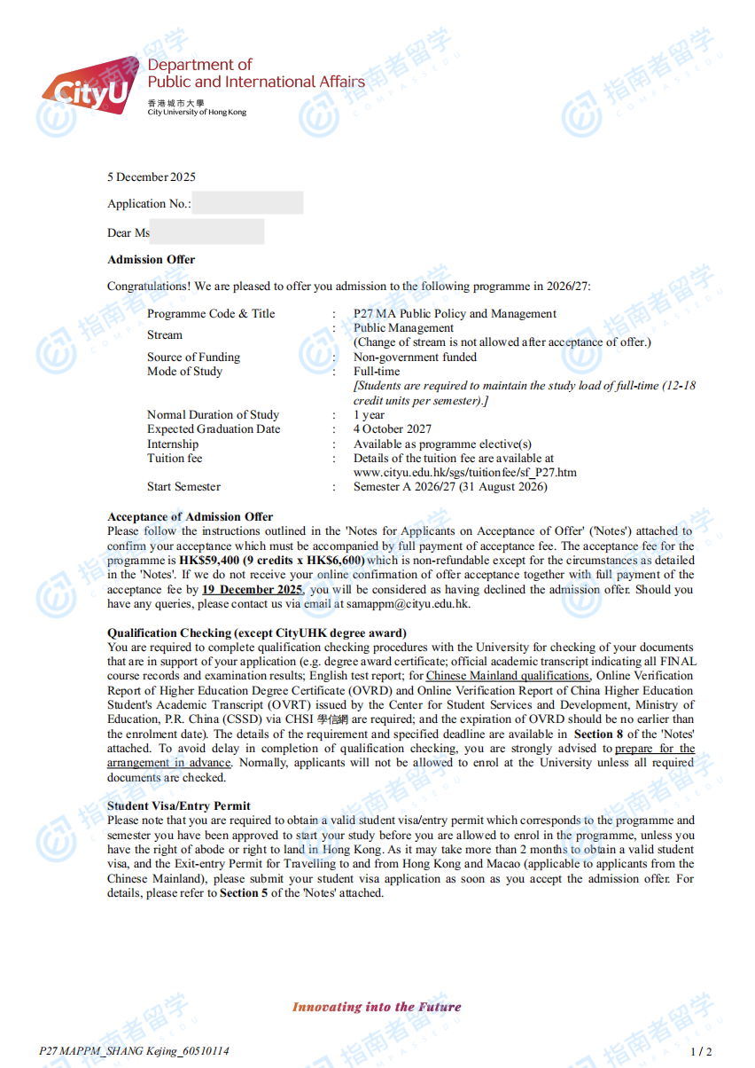 香港城市大學公共政策與管理文學碩士研究生offer一枚