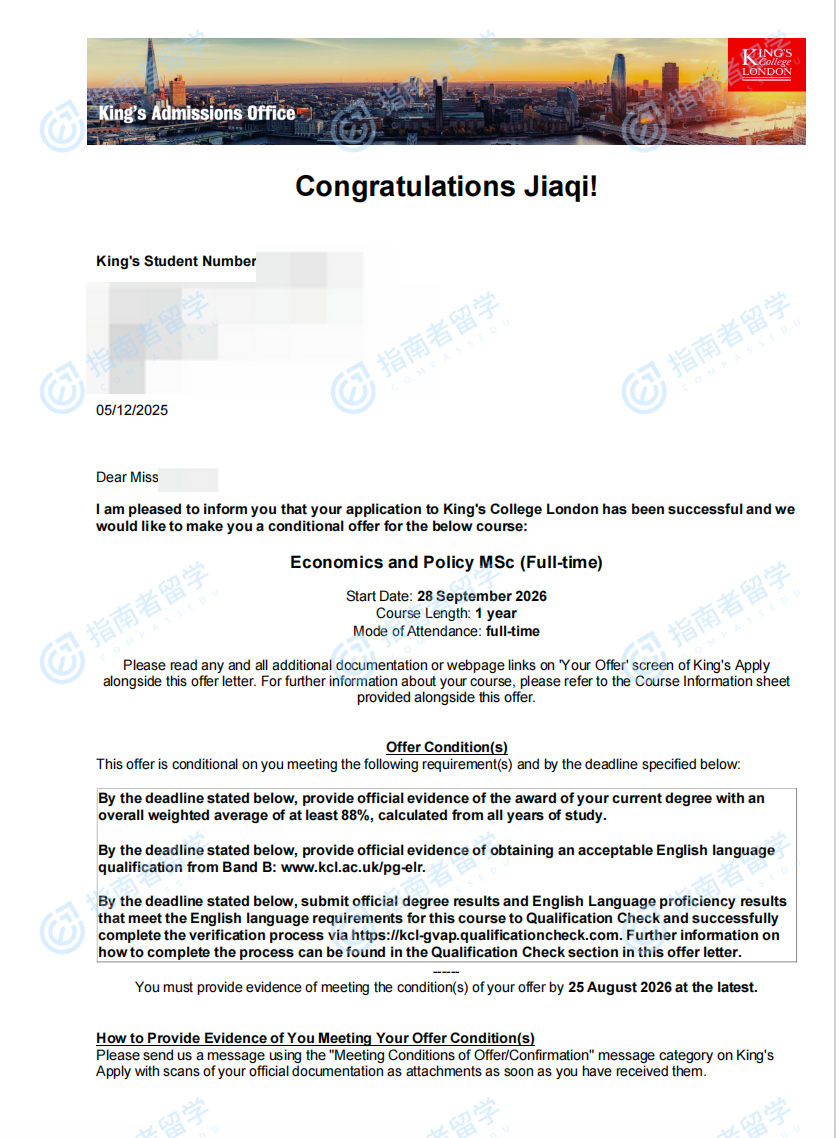 倫敦大學國王學院經(jīng)濟與政策理學碩士研究生offer一枚
